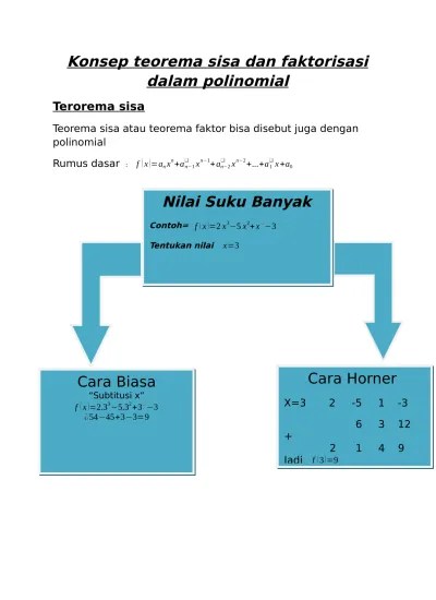 Teorema faktor dapat digunakan untuk menentukan faktor lain atau . Tentukan sisa pembagian suku banyak . Dengan teorema sisa 1 : Contoh soal teorema sisa : Download soal pemantapan polinomial (suku banyak) :